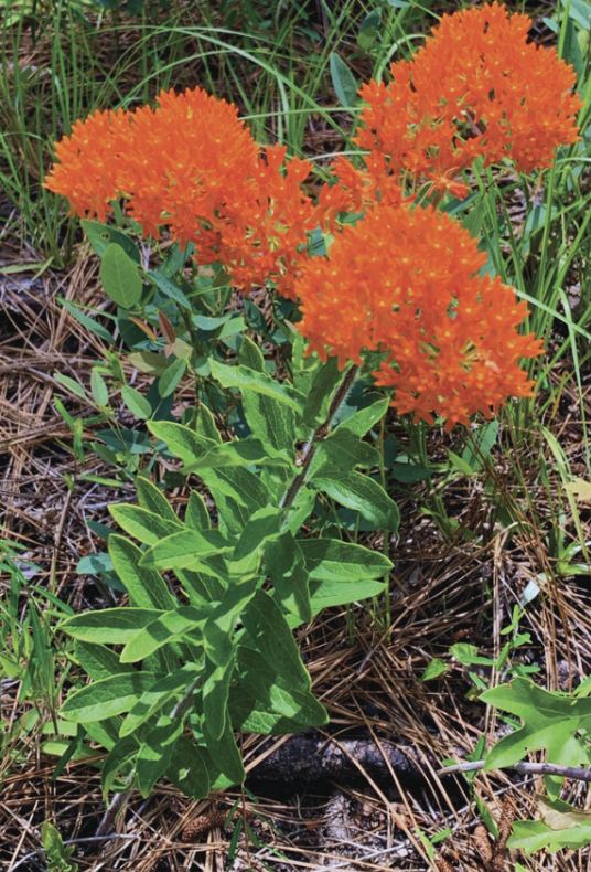 Asclepius Tuberosa gets 1–3ft tall, and likes plenty of sun. It needs a dry, well-drained location. It comes back year after year, and flowers throughout the summer. It has a long tap root that can extend down many feet, which makes it drought tolerant as it gets older. It’s not aggressive. The orange flowers look good beside pink swamp milkweed, roundpod St. John’s wort, and mallow.